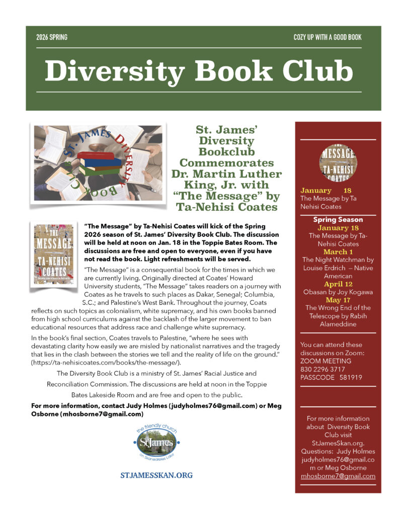 The Diversity Book Club is a ministry of St. James’ Racial Justice and Reconciliation Commission. The discussions are held at noon in the Toppie Bates Lakeside Room (and via Zoom) and are free and open to the public. For more information, contact Judy Holmes (judyholmes76@gmail.com) or Meg Osborne (mhosborne7@gmail.com).
