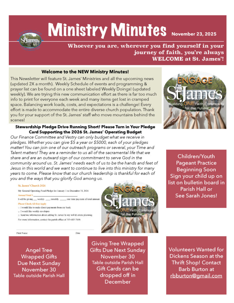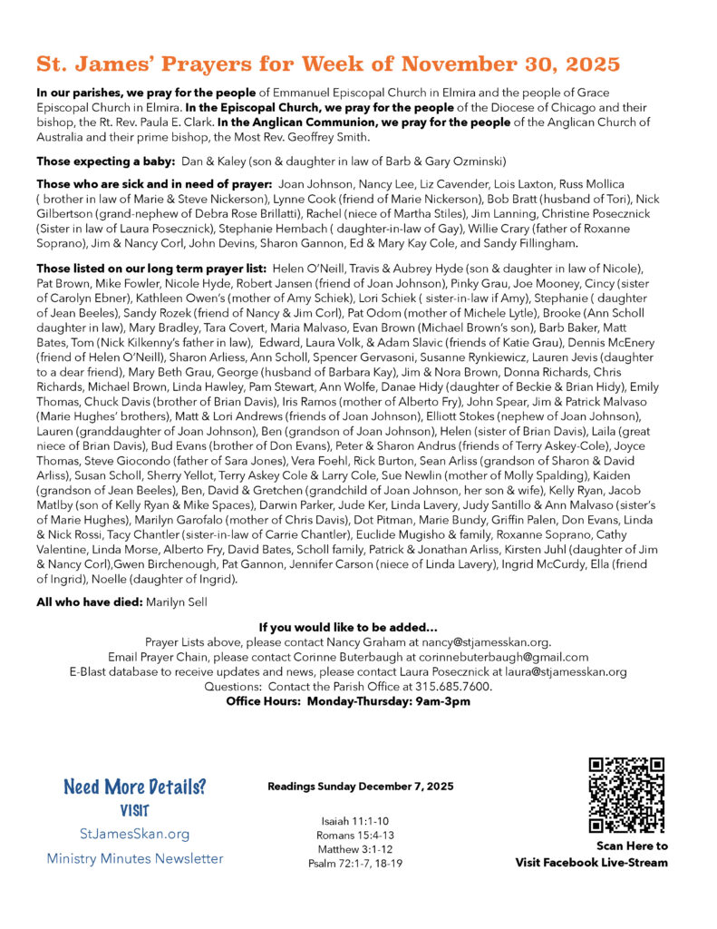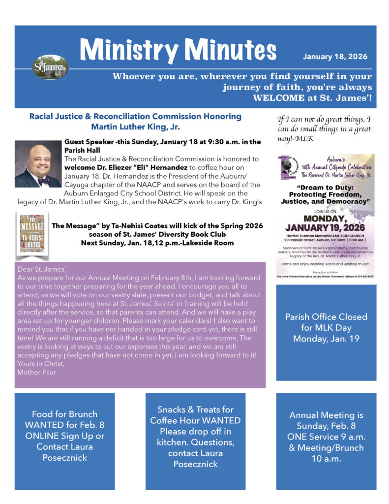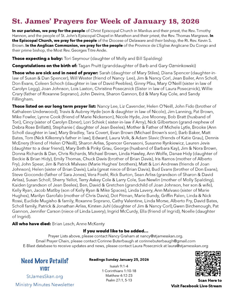 St. James’ offers a one sheet calendar & prayer list weekly and Ministry Minutes twice a month featuring highlights from the vibrant ministries offered at St. James’. If you have any questions please contact the Parish Office at 315-675-7600 or Laura Posecznick at laura@stjamesskan.org.