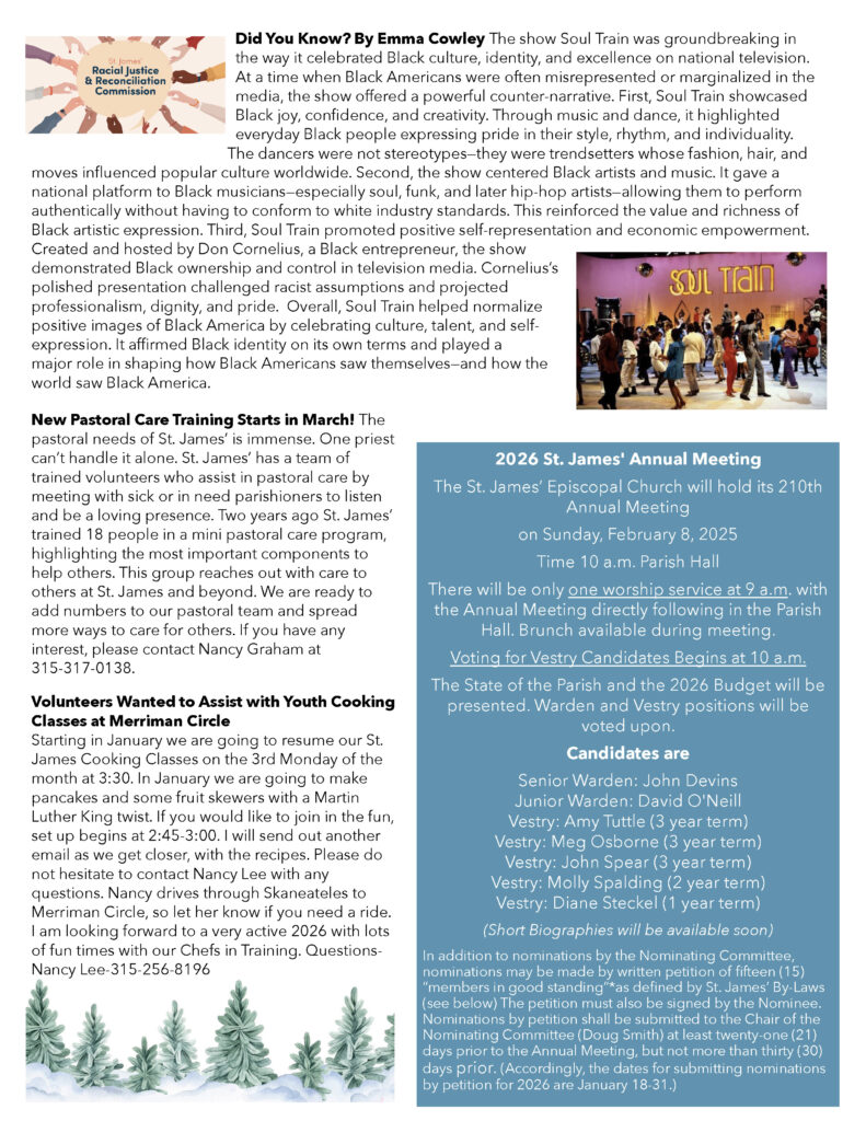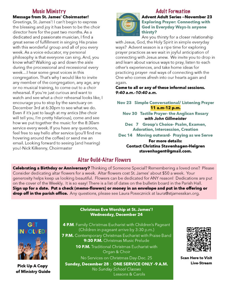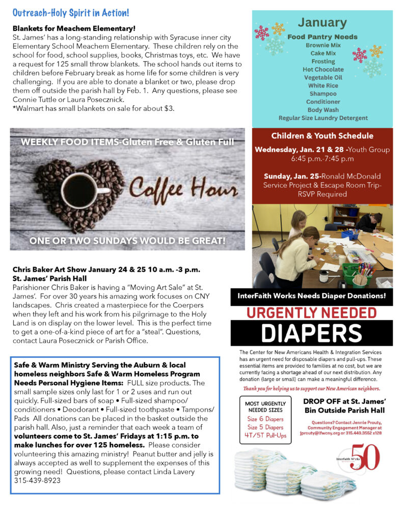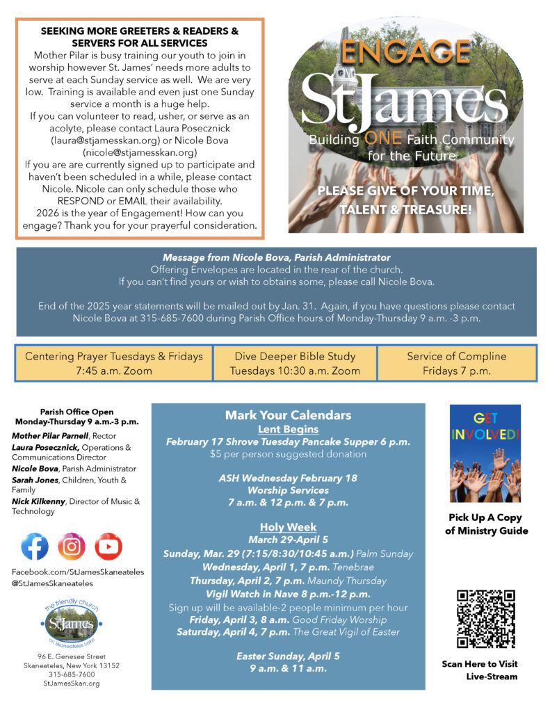 St. James’ offers a one sheet calendar & prayer list weekly and Ministry Minutes twice a month featuring highlights from the vibrant ministries offered at St. James’. If you have any questions please contact the Parish Office at 315-675-7600 or Laura Posecznick at laura@stjamesskan.org.
